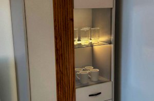 Вторая дверь, выполненная со стеклянной вставкой, позволяет демонстрировать коллекции, декоративные предметы или книги, придавая вашему пространству дополнительный шарм и элегантность.