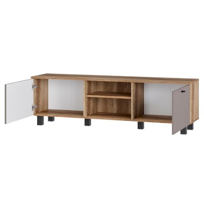 Тумба под ТВ "Олива" выполнена из качественной ЛДСП в цвете "дуб каньон", а фасады отделаны МДФ. На столешнице тумбы поместится телевизор практически любого размера, а в нишах можно хранить необходимую технику. В гостиной "Олива" квадратные черные опоры - 50х50х100 мм.