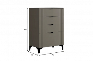 Комод изготовлен из качественных материалов: корпус выполнен из ЛДСП, что гарантирует прочность и долговечность, а фасад, выполненный из МДФ в плёнке ПВХ, не только выглядит эстетично, но и защищает комод от повреждений. Особое внимание заслуживает фрезеровка фасадов, которая придаёт изделию изысканный вид.